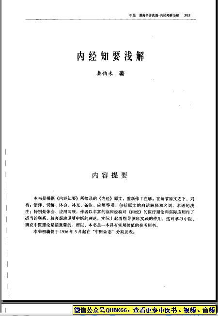 《内经知要浅解》本站专注中医资源,涵盖视频,音频,电子文档等等等……关注微信公众号【QHBK66】,回复对应编码,获网盘下载地址。 更多中医视频,音频,电子书等《中医超级资源库》目录,查看网址:https://qr09.cn/FDjI4p