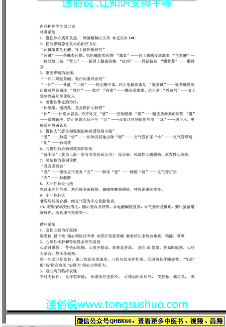 内科护理学全部口诀2本站专注中医资源,涵盖视频,音频,电子文档等等等……关注微信公众号【QHBK66】,回复对应编码,获网盘下载地址。 更多中医视频,音频,电子书等《中医超级资源库》目录,查看网址:https://qr09.cn/FDjI4p