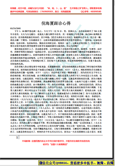 倪海厦跟诊心得本站专注中医资源,涵盖视频,音频,电子文档等等等……关注微信公众号【QHBK66】,回复对应编码,获网盘下载地址。 更多中医视频,音频,电子书等《中医超级资源库》目录,查看网址:https://qr09.cn/FDjI4p
