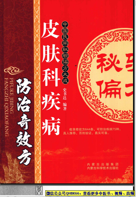 皮肤科疾病防治奇效方本站专注中医资源,涵盖视频,音频,电子文档等等等……关注微信公众号【QHBK66】,回复对应编码,获网盘下载地址。 更多中医视频,音频,电子书等《中医超级资源库》目录,查看网址:https://qr09.cn/FDjI4p