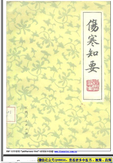 伤寒知要本站专注中医资源,涵盖视频,音频,电子文档等等等……关注微信公众号【QHBK66】,回复对应编码,获网盘下载地址。 更多中医视频,音频,电子书等《中医超级资源库》目录,查看网址:https://qr09.cn/FDjI4p
