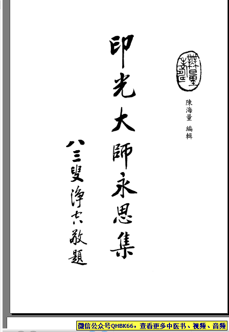 印光大师永思集本站专注中医资源,涵盖视频,音频,电子文档等等等……关注微信公众号【QHBK66】,回复对应编码,获网盘下载地址。 更多中医视频,音频,电子书等《中医超级资源库》目录,查看网址:https://qr09.cn/FDjI4p