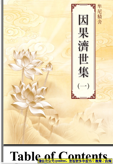 因果濟世集-第一集本站专注中医资源,涵盖视频,音频,电子文档等等等……关注微信公众号【QHBK66】,回复对应编码,获网盘下载地址。 更多中医视频,音频,电子书等《中医超级资源库》目录,查看网址:https://qr09.cn/FDjI4p