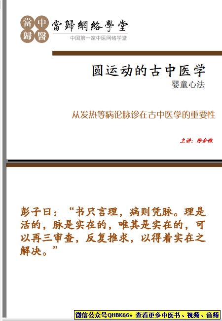 圆运动之婴童心法+第三讲本站专注中医资源,涵盖视频,音频,电子文档等等等……关注微信公众号【QHBK66】,回复对应编码,获网盘下载地址。 更多中医视频,音频,电子书等《中医超级资源库》目录,查看网址:https://qr09.cn/FDjI4p
