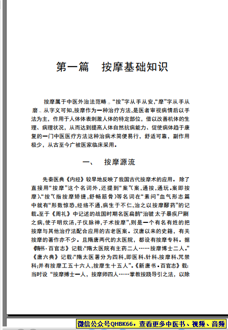 张百奇着+按摩奇术本站专注中医资源,涵盖视频,音频,电子文档等等等……关注微信公众号【QHBK66】,回复对应编码,获网盘下载地址。 更多中医视频,音频,电子书等《中医超级资源库》目录,查看网址:https://qr09.cn/FDjI4p