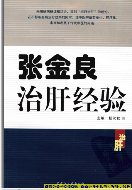 张金良治肝经验(高清版)本站专注中医资源,涵盖视频,音频,电子文档等等等……关注微信公众号【QHBK66】,回复对应编码,获网盘下载地址。 更多中医视频,音频,电子书等《中医超级资源库》目录,查看网址:https://qr09.cn/FDjI4p