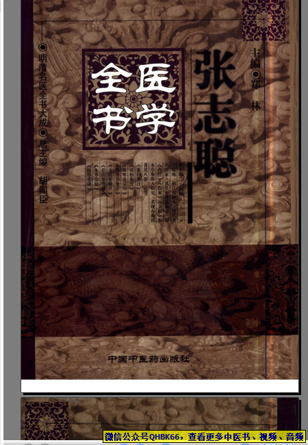 张志聪医学全书本站专注中医资源,涵盖视频,音频,电子文档等等等……关注微信公众号【QHBK66】,回复对应编码,获网盘下载地址。 更多中医视频,音频,电子书等《中医超级资源库》目录,查看网址:https://qr09.cn/FDjI4p