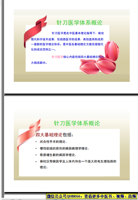 针刀医学体系概论本站专注中医资源,涵盖视频,音频,电子文档等等等……关注微信公众号【QHBK66】,回复对应编码,获网盘下载地址。 更多中医视频,音频,电子书等《中医超级资源库》目录,查看网址:https://qr09.cn/FDjI4p