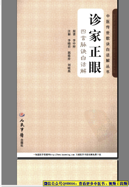 诊家正眼 四言脉诀白话解本站专注中医资源,涵盖视频,音频,电子文档等等等……关注微信公众号【QHBK66】,回复对应编码,获网盘下载地址。 更多中医视频,音频,电子书等《中医超级资源库》目录,查看网址:https://qr09.cn/FDjI4p