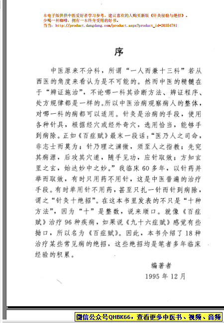 针灸十绝招(清晰版)本站专注中医资源,涵盖视频,音频,电子文档等等等……关注微信公众号【QHBK66】,回复对应编码,获网盘下载地址。 更多中医视频,音频,电子书等《中医超级资源库》目录,查看网址:https://qr09.cn/FDjI4p