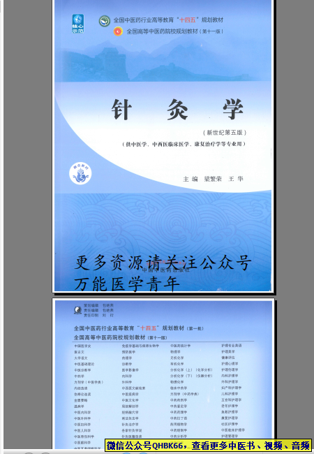 针灸学 万能医学青年本站专注中医资源,涵盖视频,音频,电子文档等等等……关注微信公众号【QHBK66】,回复对应编码,获网盘下载地址。 更多中医视频,音频,电子书等《中医超级资源库》目录,查看网址:https://qr09.cn/FDjI4p