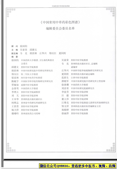 中国常用中草药彩色图谱本站专注中医资源,涵盖视频,音频,电子文档等等等……关注微信公众号【QHBK66】,回复对应编码,获网盘下载地址。 更多中医视频,音频,电子书等《中医超级资源库》目录,查看网址:https://qr09.cn/FDjI4p