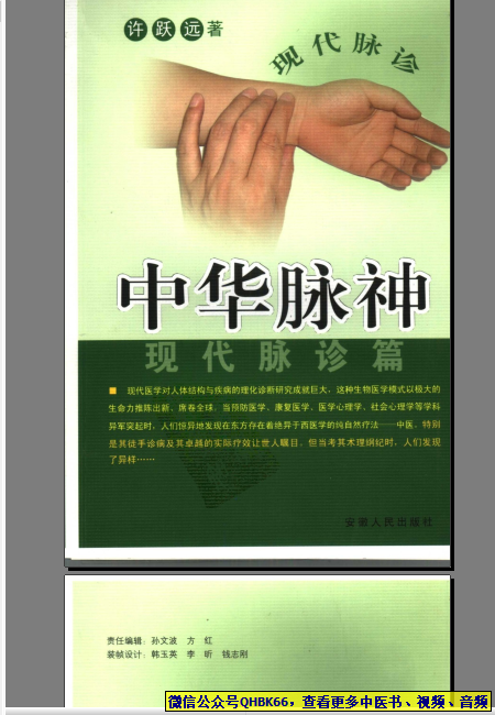 中华脉神-现代脉诊篇本站专注中医资源,涵盖视频,音频,电子文档等等等……关注微信公众号【QHBK66】,回复对应编码,获网盘下载地址。 更多中医视频,音频,电子书等《中医超级资源库》目录,查看网址:https://qr09.cn/FDjI4p