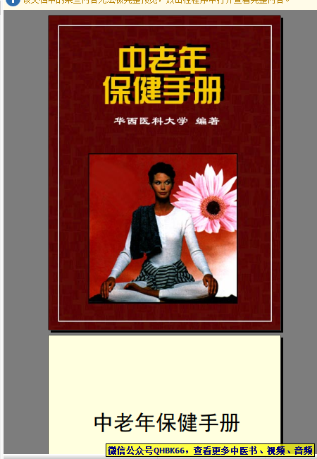 中老年保健手册本站专注中医资源,涵盖视频,音频,电子文档等等等……关注微信公众号【QHBK66】,回复对应编码,获网盘下载地址。 更多中医视频,音频,电子书等《中医超级资源库》目录,查看网址:https://qr09.cn/FDjI4p
