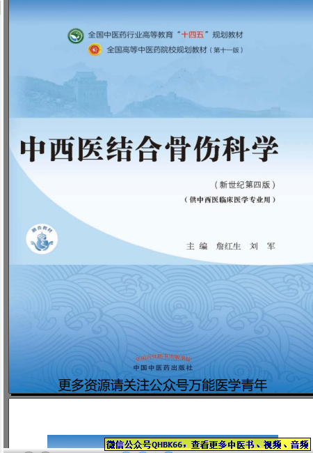中西医结合骨伤科学本站专注中医资源,涵盖视频,音频,电子文档等等等……关注微信公众号【QHBK66】,回复对应编码,获网盘下载地址。 更多中医视频,音频,电子书等《中医超级资源库》目录,查看网址:https://qr09.cn/FDjI4p