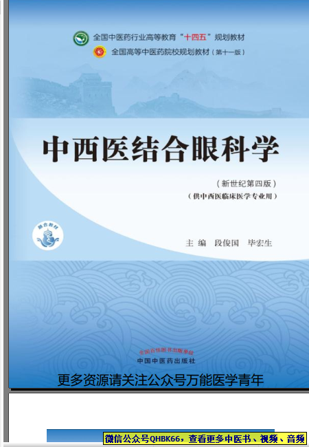 中西医结合眼科学本站专注中医资源,涵盖视频,音频,电子文档等等等……关注微信公众号【QHBK66】,回复对应编码,获网盘下载地址。 更多中医视频,音频,电子书等《中医超级资源库》目录,查看网址:https://qr09.cn/FDjI4p