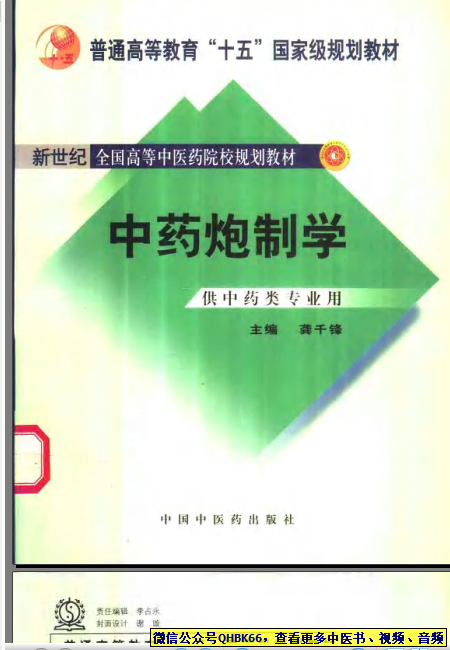 中药炮制学 本站专注中医资源,涵盖视频,音频,电子文档等等等……关注微信公众号【QHBK66】,回复对应编码,获网盘下载地址。 更多中医视频,音频,电子书等《中医超级资源库》目录,查看网址:https://qr09.cn/FDjI4p