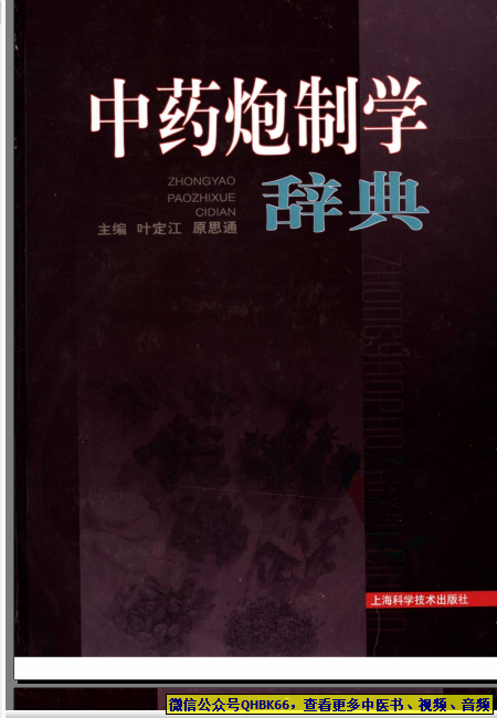 中药炮制学辞典(高清版)本站专注中医资源,涵盖视频,音频,电子文档等等等……关注微信公众号【QHBK66】,回复对应编码,获网盘下载地址。 更多中医视频,音频,电子书等《中医超级资源库》目录,查看网址:https://qr09.cn/FDjI4p