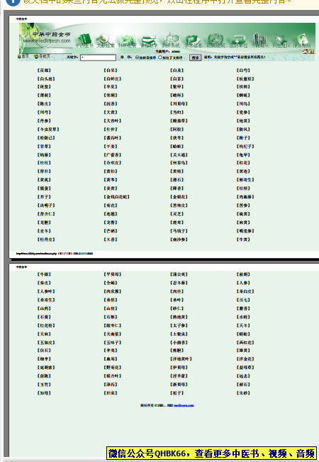 中药全书本站专注中医资源,涵盖视频,音频,电子文档等等等……关注微信公众号【QHBK66】,回复对应编码,获网盘下载地址。 更多中医视频,音频,电子书等《中医超级资源库》目录,查看网址:https://qr09.cn/FDjI4p