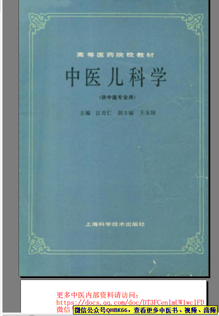 中医儿科学(第五版)本站专注中医资源,涵盖视频,音频,电子文档等等等……关注微信公众号【QHBK66】,回复对应编码,获网盘下载地址。 更多中医视频,音频,电子书等《中医超级资源库》目录,查看网址:https://qr09.cn/FDjI4p