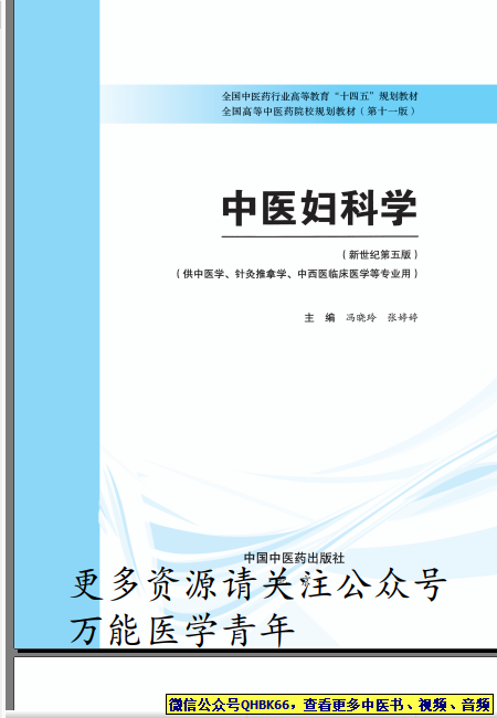 中医妇科学 万能医学青年本站专注中医资源,涵盖视频,音频,电子文档等等等……关注微信公众号【QHBK66】,回复对应编码,获网盘下载地址。 更多中医视频,音频,电子书等《中医超级资源库》目录,查看网址:https://qr09.cn/FDjI4p