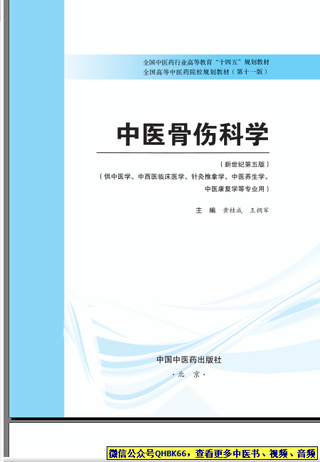 中医骨伤科学本站专注中医资源,涵盖视频,音频,电子文档等等等……关注微信公众号【QHBK66】,回复对应编码,获网盘下载地址。 更多中医视频,音频,电子书等《中医超级资源库》目录,查看网址:https://qr09.cn/FDjI4p