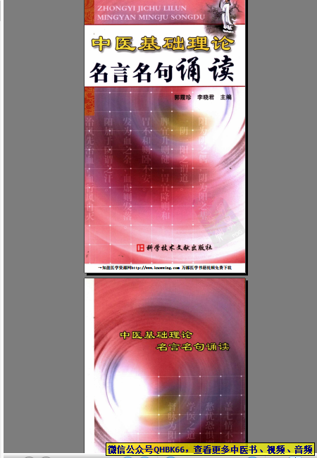 中医基础理论名言名句诵读本站专注中医资源,涵盖视频,音频,电子文档等等等……关注微信公众号【QHBK66】,回复对应编码,获网盘下载地址。 更多中医视频,音频,电子书等《中医超级资源库》目录,查看网址:https://qr09.cn/FDjI4p