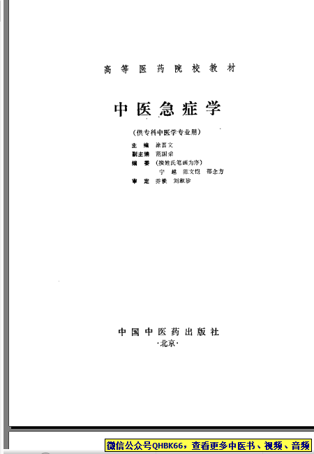 中医急症学本站专注中医资源,涵盖视频,音频,电子文档等等等……关注微信公众号【QHBK66】,回复对应编码,获网盘下载地址。 更多中医视频,音频,电子书等《中医超级资源库》目录,查看网址:https://qr09.cn/FDjI4p