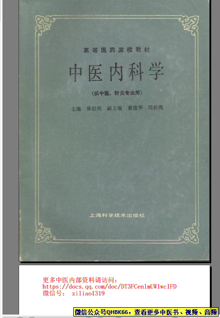 中医内科学(第五版)本站专注中医资源,涵盖视频,音频,电子文档等等等……关注微信公众号【QHBK66】,回复对应编码,获网盘下载地址。 更多中医视频,音频,电子书等《中医超级资源库》目录,查看网址:https://qr09.cn/FDjI4p