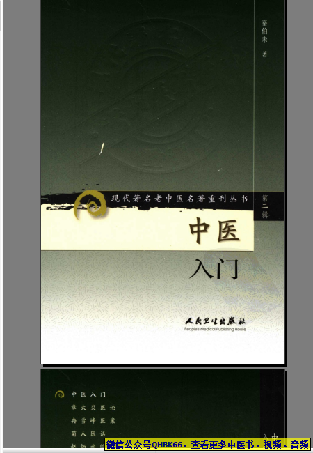 中医入门(高清版)本站专注中医资源,涵盖视频,音频,电子文档等等等……关注微信公众号【QHBK66】,回复对应编码,获网盘下载地址。 更多中医视频,音频,电子书等《中医超级资源库》目录,查看网址:https://qr09.cn/FDjI4p