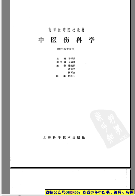 中医伤科学(第五版)本站专注中医资源,涵盖视频,音频,电子文档等等等……关注微信公众号【QHBK66】,回复对应编码,获网盘下载地址。 更多中医视频,音频,电子书等《中医超级资源库》目录,查看网址:https://qr09.cn/FDjI4p