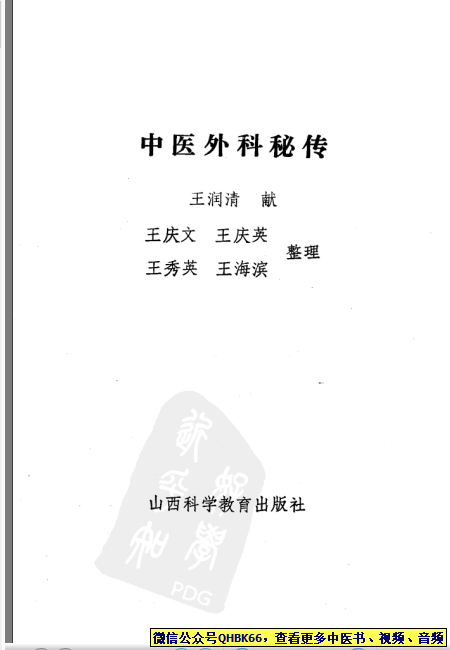 中医外科秘传(扫描版)本站专注中医资源,涵盖视频,音频,电子文档等等等……关注微信公众号【QHBK66】,回复对应编码,获网盘下载地址。 更多中医视频,音频,电子书等《中医超级资源库》目录,查看网址:https://qr09.cn/FDjI4p