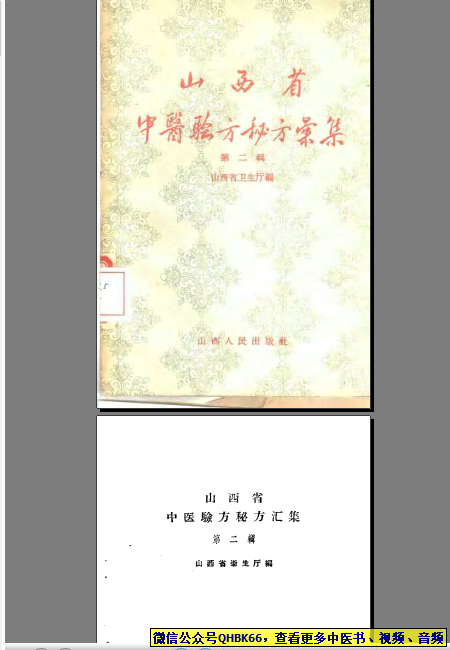 中医验方秘方汇集本站专注中医资源,涵盖视频,音频,电子文档等等等……关注微信公众号【QHBK66】,回复对应编码,获网盘下载地址。 更多中医视频,音频,电子书等《中医超级资源库》目录,查看网址:https://qr09.cn/FDjI4p