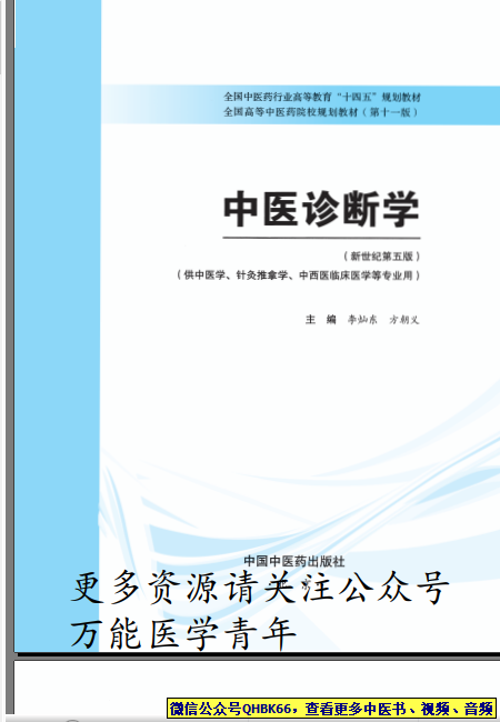 中医诊断学 万能医学青年本站专注中医资源,涵盖视频,音频,电子文档等等等……关注微信公众号【QHBK66】,回复对应编码,获网盘下载地址。 更多中医视频,音频,电子书等《中医超级资源库》目录,查看网址:https://qr09.cn/FDjI4p