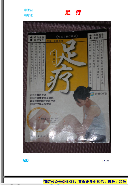 中医自然疗法(足疗)本站专注中医资源,涵盖视频,音频,电子文档等等等……关注微信公众号【QHBK66】,回复对应编码,获网盘下载地址。 更多中医视频,音频,电子书等《中医超级资源库》目录,查看网址:https://qr09.cn/FDjI4p