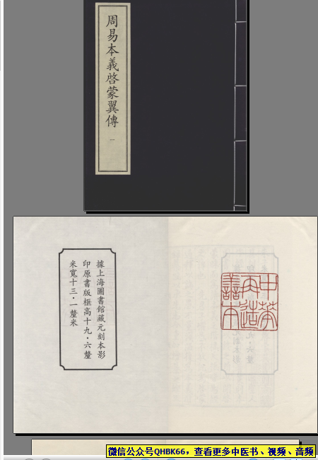 周易本义启蒙翼传 元刻本本站专注中医资源,涵盖视频,音频,电子文档等等等……关注微信公众号【QHBK66】,回复对应编码,获网盘下载地址。 更多中医视频,音频,电子书等《中医超级资源库》目录,查看网址:https://qr09.cn/FDjI4p