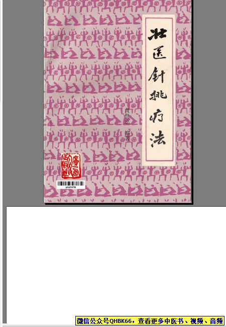 壮医针挑疗法本站专注中医资源,涵盖视频,音频,电子文档等等等……关注微信公众号【QHBK66】,回复对应编码,获网盘下载地址。 更多中医视频,音频,电子书等《中医超级资源库》目录,查看网址:https://qr09.cn/FDjI4p