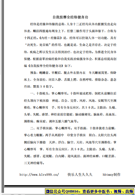 自我按摩全经络健身功本站专注中医资源,涵盖视频,音频,电子文档等等等……关注微信公众号【QHBK66】,回复对应编码,获网盘下载地址。 更多中医视频,音频,电子书等《中医超级资源库》目录,查看网址:https://qr09.cn/FDjI4p