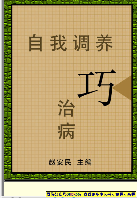 自我调养好治病本站专注中医资源,涵盖视频,音频,电子文档等等等……关注微信公众号【QHBK66】,回复对应编码,获网盘下载地址。 更多中医视频,音频,电子书等《中医超级资源库》目录,查看网址:https://qr09.cn/FDjI4p