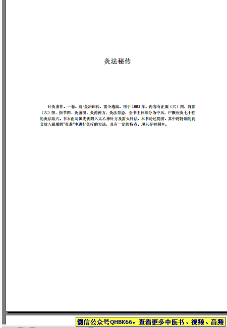 灸法秘传本站专注中医资源,涵盖视频,音频,电子文档等等等……关注微信公众号【QHBK66】,回复对应编码,获网盘下载地址。 更多中医视频,音频,电子书等《中医超级资源库》目录,查看网址:https://qr09.cn/FDjI4p