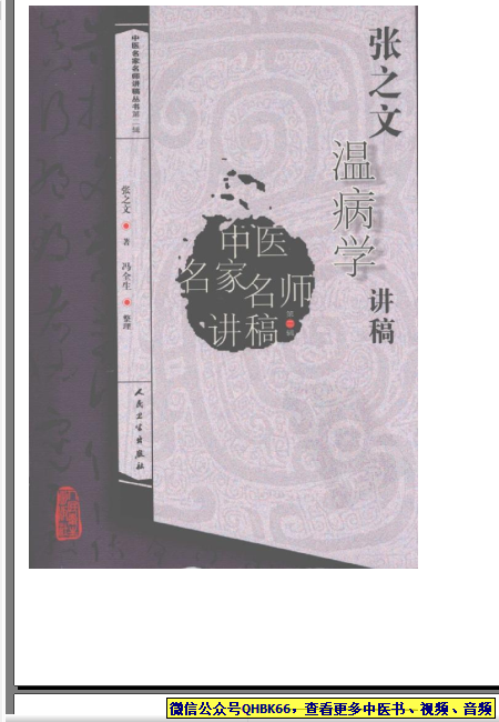 张之文温病学讲稿本站专注中医资源,涵盖视频,音频,电子文档等等等……关注微信公众号【QHBK66】,回复对应编码,获网盘下载地址。 更多中医视频,音频,电子书等《中医超级资源库》目录,查看网址:https://qr09.cn/FDjI4p