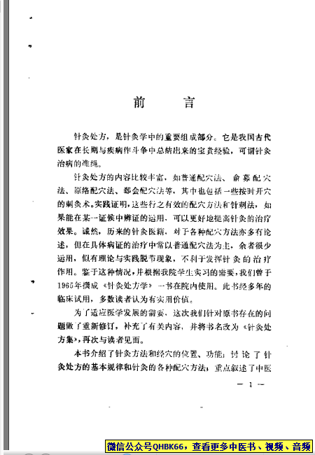 针灸处方集(阎洪臣)本站专注中医资源,涵盖视频,音频,电子文档等等等……关注微信公众号【QHBK66】,回复对应编码,获网盘下载地址。 更多中医视频,音频,电子书等《中医超级资源库》目录,查看网址:https://qr09.cn/FDjI4p