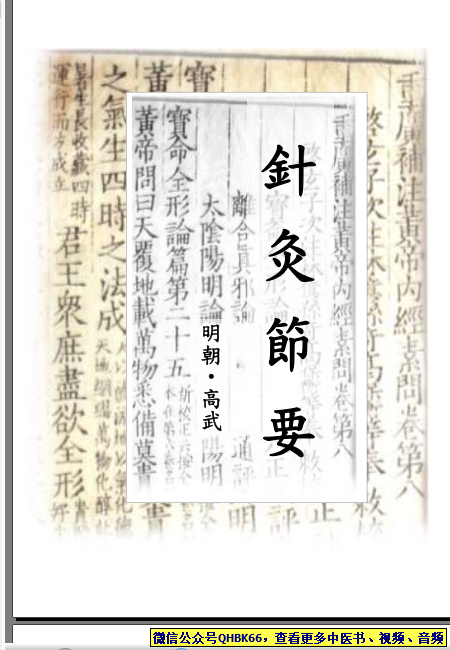 针灸节要本站专注中医资源,涵盖视频,音频,电子文档等等等……关注微信公众号【QHBK66】,回复对应编码,获网盘下载地址。 更多中医视频,音频,电子书等《中医超级资源库》目录,查看网址:https://qr09.cn/FDjI4p